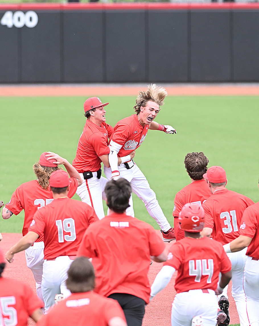 It took ten innings and many of the same frustrations of a lost season. But in the end the Buckeyes and Tyler Pettorini (above, center) celebrated his game-winning double on Senior Day to send the crowd home with a smile...11-10 over Illinois, in ten innings.