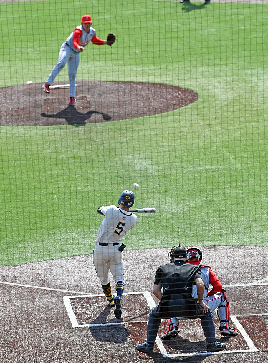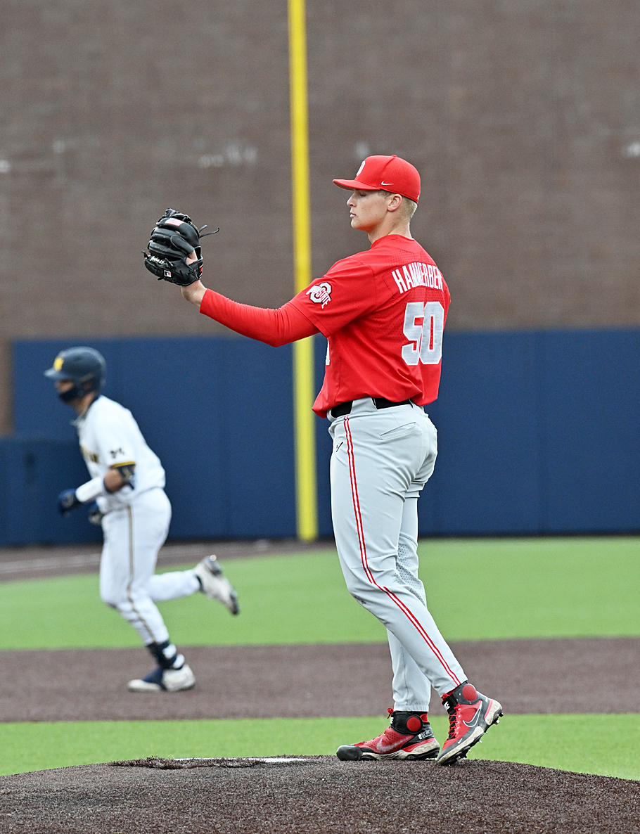 Michigan's Jimmy Obertop (background) circles the bases with the tying home run in the ninth inning. An inning later the Buckeyes drop the series opener in Ann Arbor in the tenth. Read about the game on Press Pros.