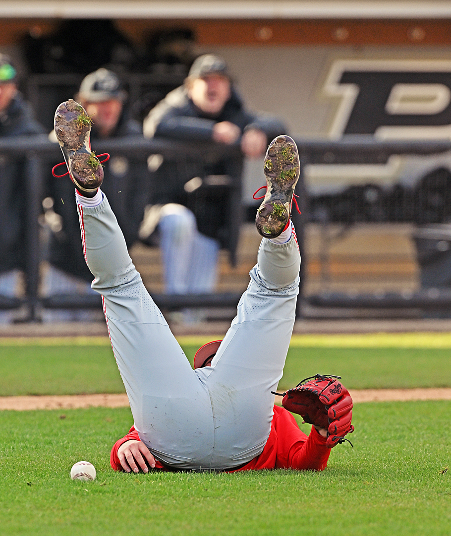 The weather was horrid...on a brutal day to pitch, catch, bat, field, or do almost anything baseball, Purdue upended the Buckeyes (and pitcher Jake Johnson, below) after their fast early start to take the Big Ten opener, 7-5.