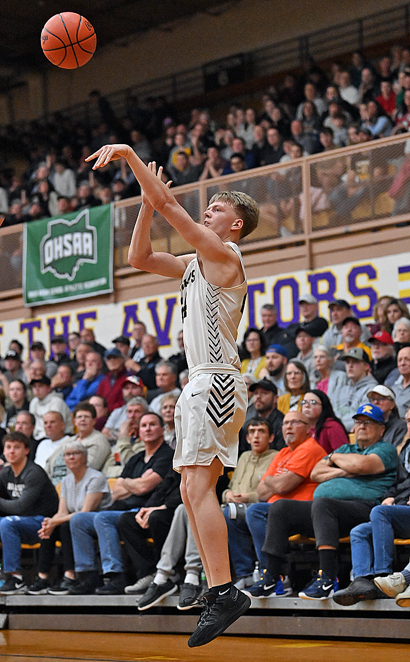 As if by script, Cam Elwer (above, in white) and his relatives, along with some enviable depth of roster, erupted during the middle sixteen minutes of the Division VII regional final to send a competitive Botkins home, 62-39.