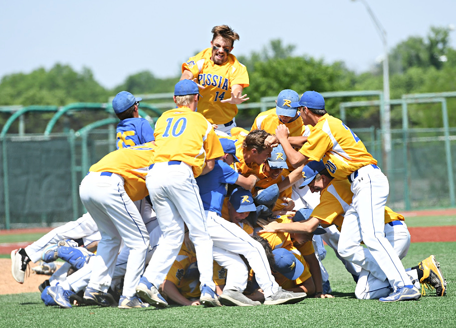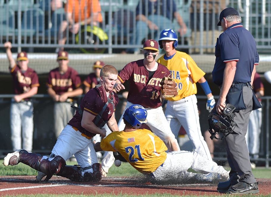 The winning run...Russia's Jude Counts strains through flying dirt and discarded equipment to score the winning run in the bottom of the eighth of Thursday's Division IV state semi-final game with St. Henry. The Raiders' 1-0 win qualifies them for Saturday's championship round for a second straight year. Read Hal McCoy in the latest Press Pros feature.
