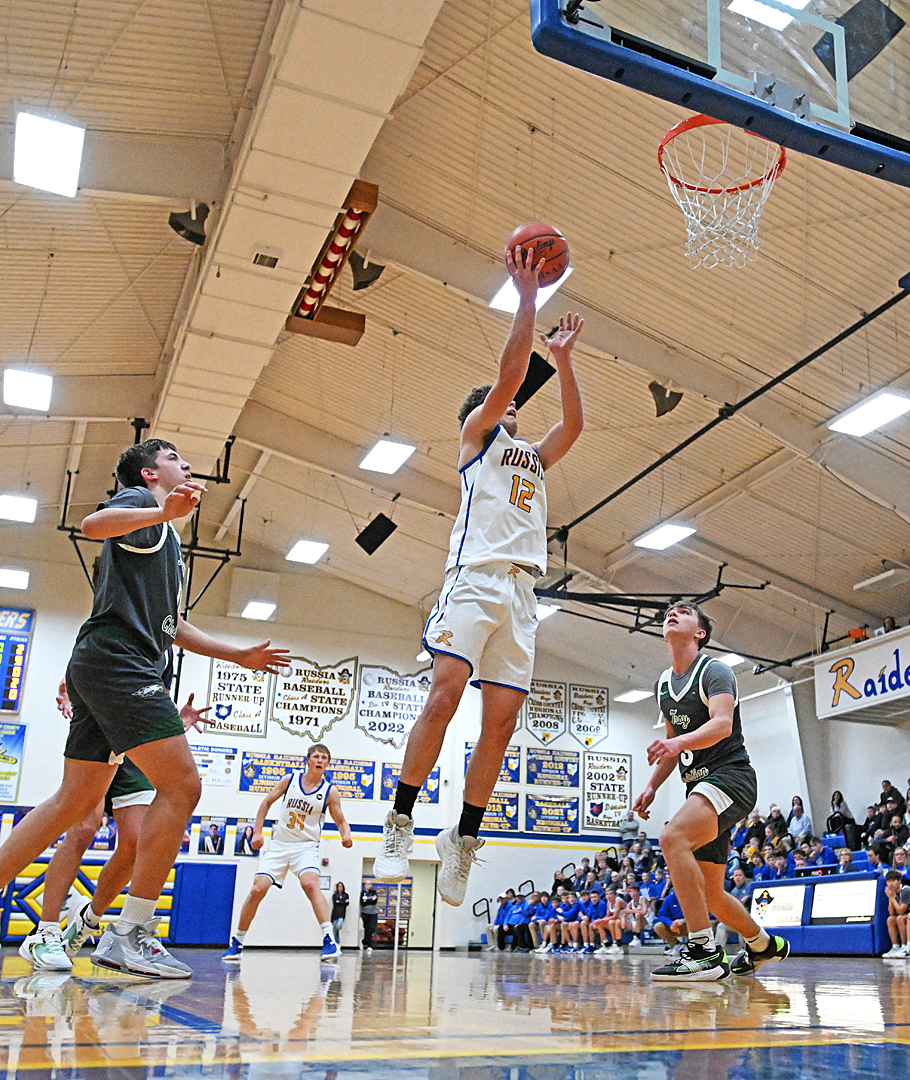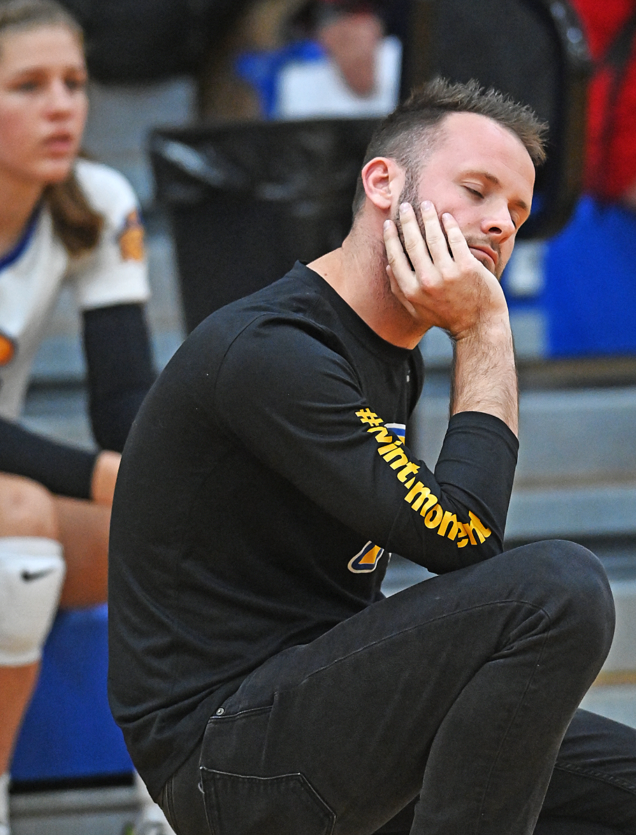 Not on Kate, you don't!...Russia's Kate Sherman smothers the shot attempt of Lehman's Taylor Geise during Division IV district semi-final volleyball action in Troy Tuesday. Two Shelby County League teams, Russia and Fort Loramie, advanced to the weekend's district finals. Read about it in Wednesday's Press Pros.