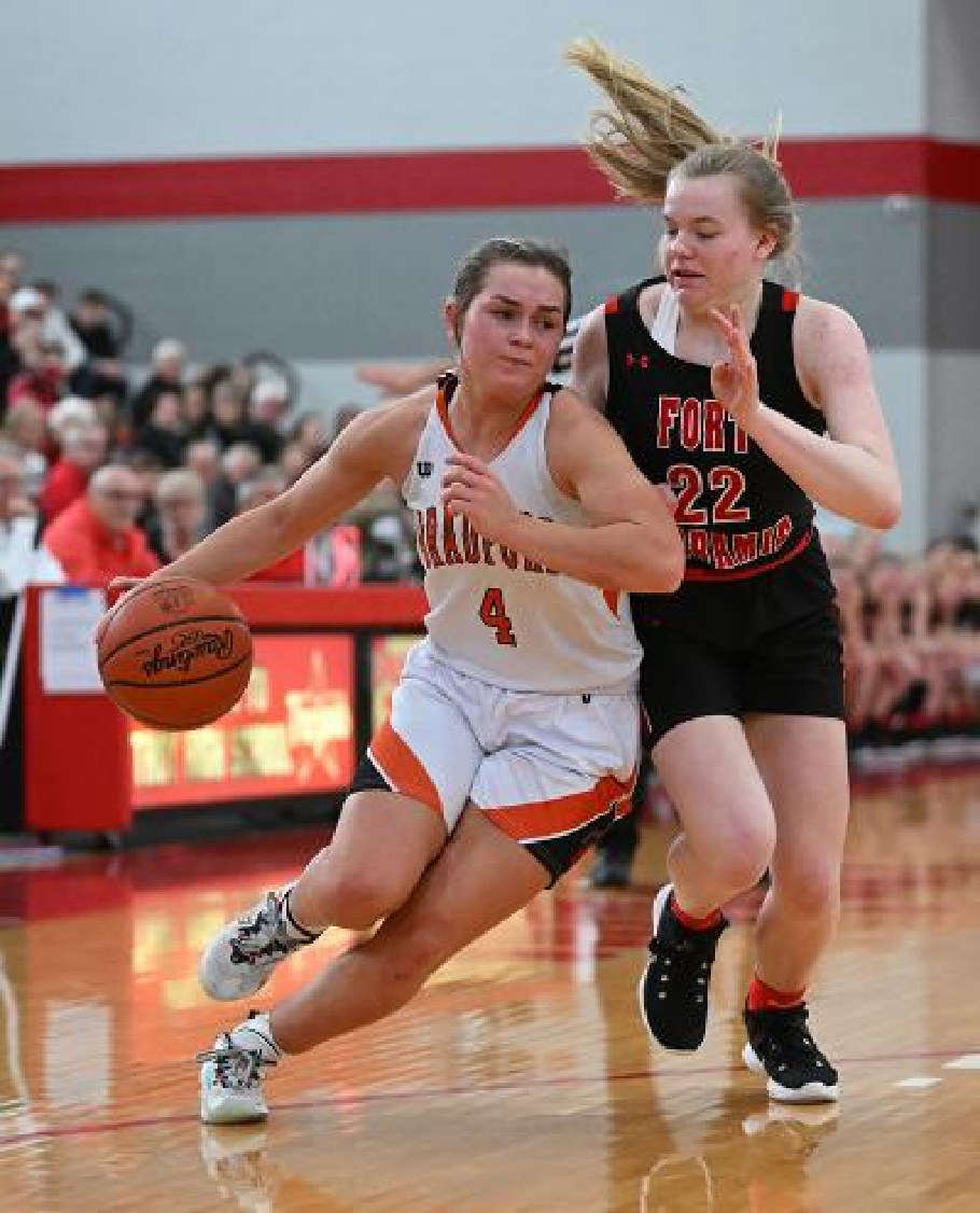Fort Loramie and Tri-Village focused on the business at hand Saturday, dispatching their respective opponents with second-half, running-clock dominance, with Loramie's Skylar Albers' defense making it rough on Bradford's Austy Miller (PressPros Feature Photo by Lee Woolery).