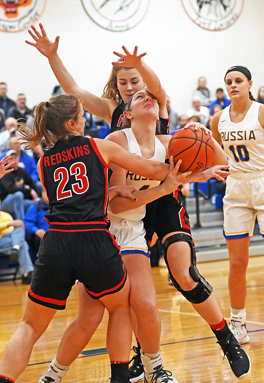 Fort Loramie showed their pressure defense (below) along with torrid three-point shooting Thursday to remain unbeaten with a 59-37 win over Russia in Shelby County League play. Read about the game in the latest Press Pros update.