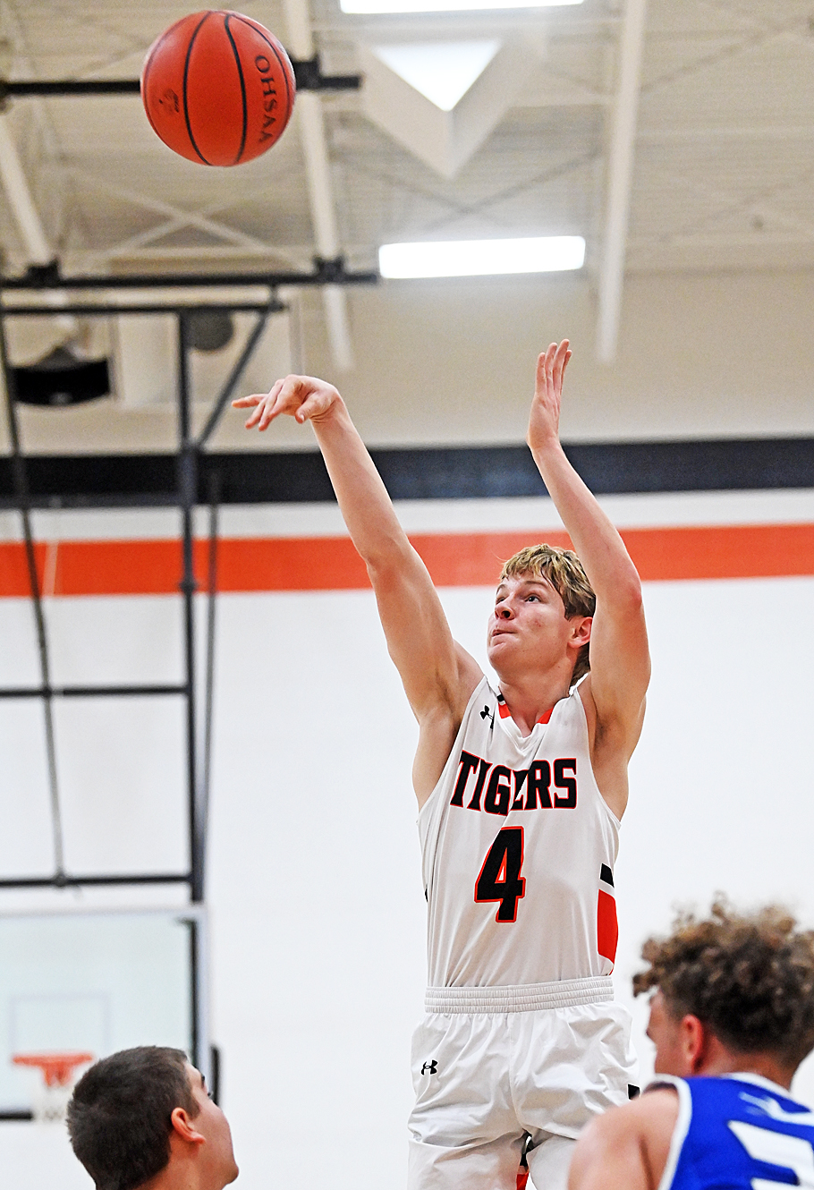 For a while they couldn't miss. Nolan Fark (below) and the Jackson Center Tigers put on a shooting show Tuesday while holding an opponent to less than twenty points for the third game in a row. Fairlawn was the victim this time, losing to JC, 64-18. Read about the game in today's inside feature.