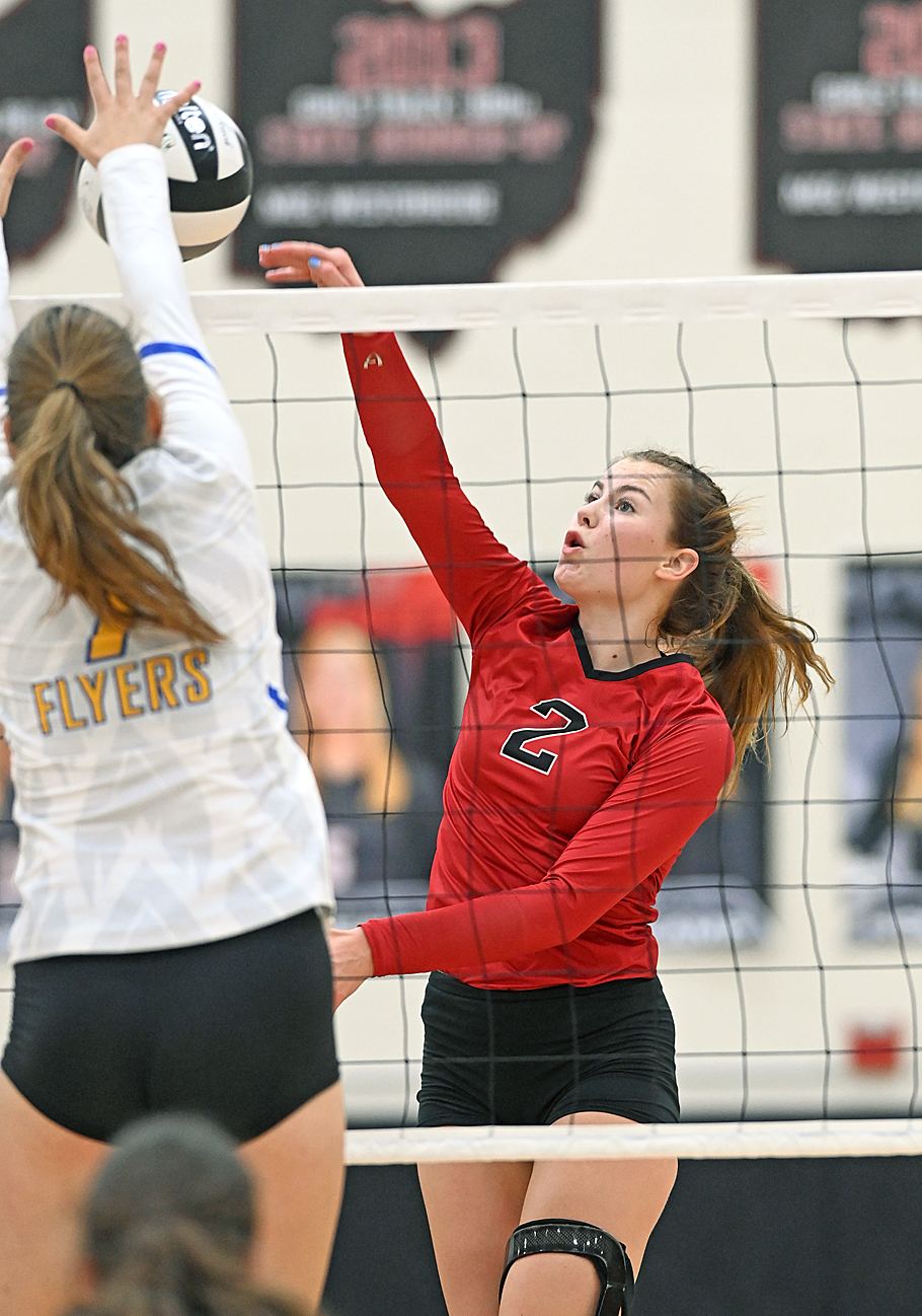 Almost artful...They were powerful, they were efficient, and Fort Loramie made it look easy (Riley Heitkamp, below), handing Jackson Center its first loss in Tuesday Shelby County League volleyball. Read about the match in today's inside feature.