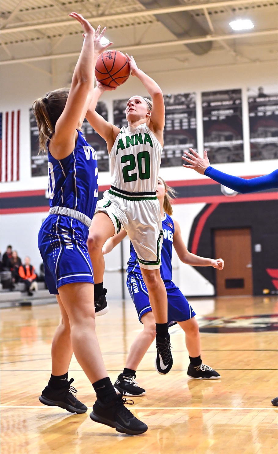 Unstoppable...Anna's Ella Doseck (#20, below) scored 20 points and directed the Rockets to their 21st win of the season while knocking Versailles out of the D-III regional tournament Wednesday at Springfield. Read about Doseck and the game in today's Press Pros.