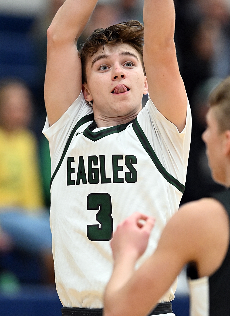 It counted...But Christian Brusman's halfcourt shot to end the first quarter (above) appears to be late with the scoreboard clock in the background. Nonetheless, it was called good and the Eagles rallied for four quarters to knock off the #2-ranked Division II Ottawa-Glandorf Titans Saturday. Read more about the game in Sunday's Press Pros.