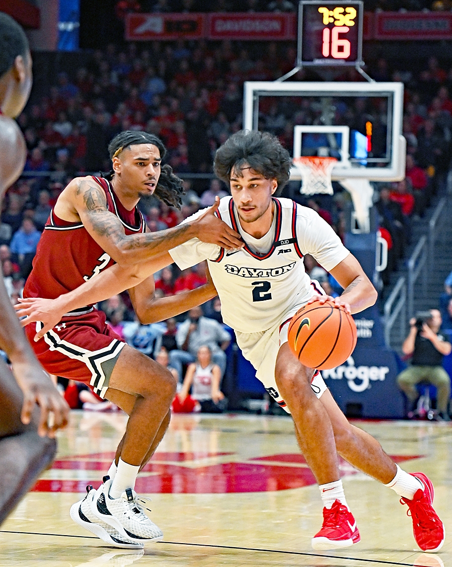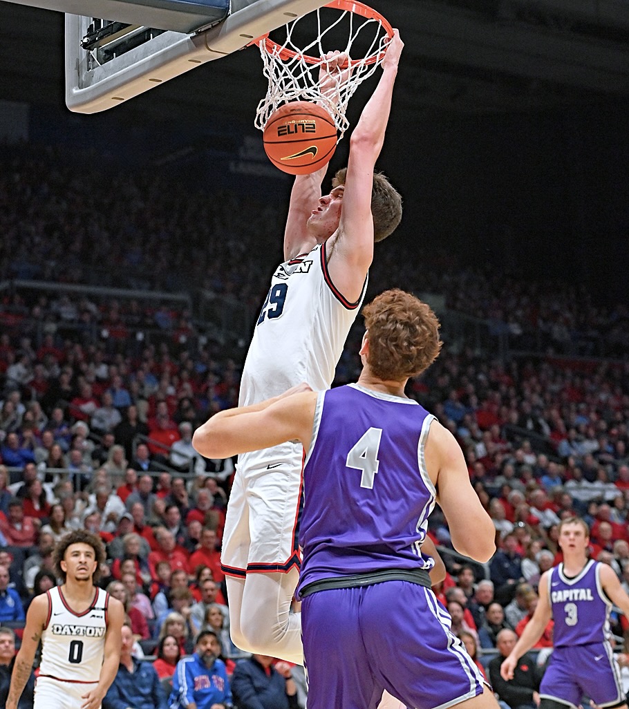 With the University of Dayton expected to easily dismantle DIII Capital, Flyers coach Anthony Grant rested starters Enoch Cheeks and Zed Key the entire game so he could experiment with different lineup combinations and it worked as the Frenchman, Amael L'Etang led the Flyers to a 76-55 win with a double-double of 13 points and 10 rebounds. (pictured)
