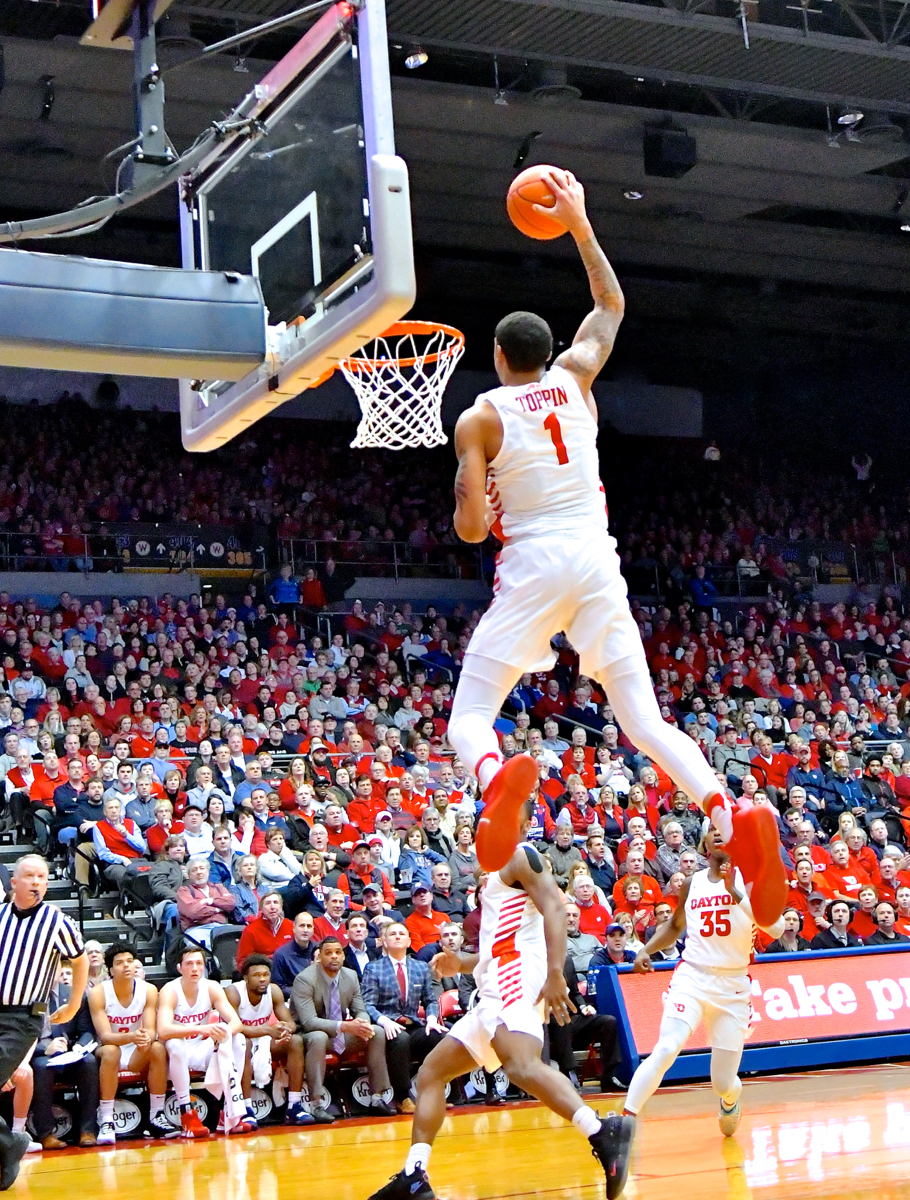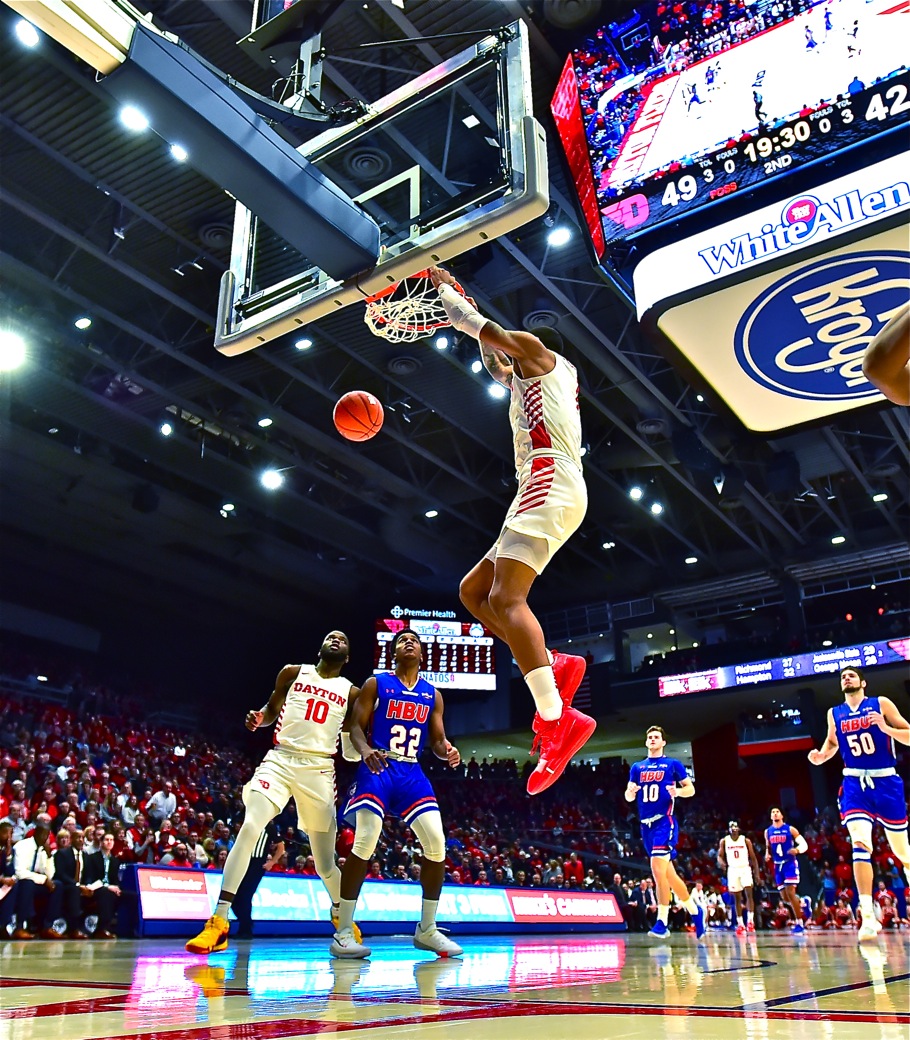 Give 'em what they come to see...Obi Toppin played above the rim (below) and the Dayton Flyers overcame a slow start shoot 59% and post an impressive 99-68 win over Houston Baptist Tuesday night. Read about it in today's Press Pros inside feature.