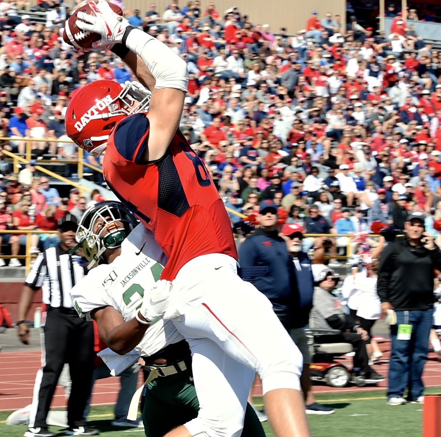 Tight end Adam Trautman became the all-time leader in pass receptions, and quarterback Jack Cook set a record for most TDs in a game. Aside from that, all the Flyers was send Jacksonville back to Florida with a 28-point loss. Hal McCoy writes the story for today's Press Pros.