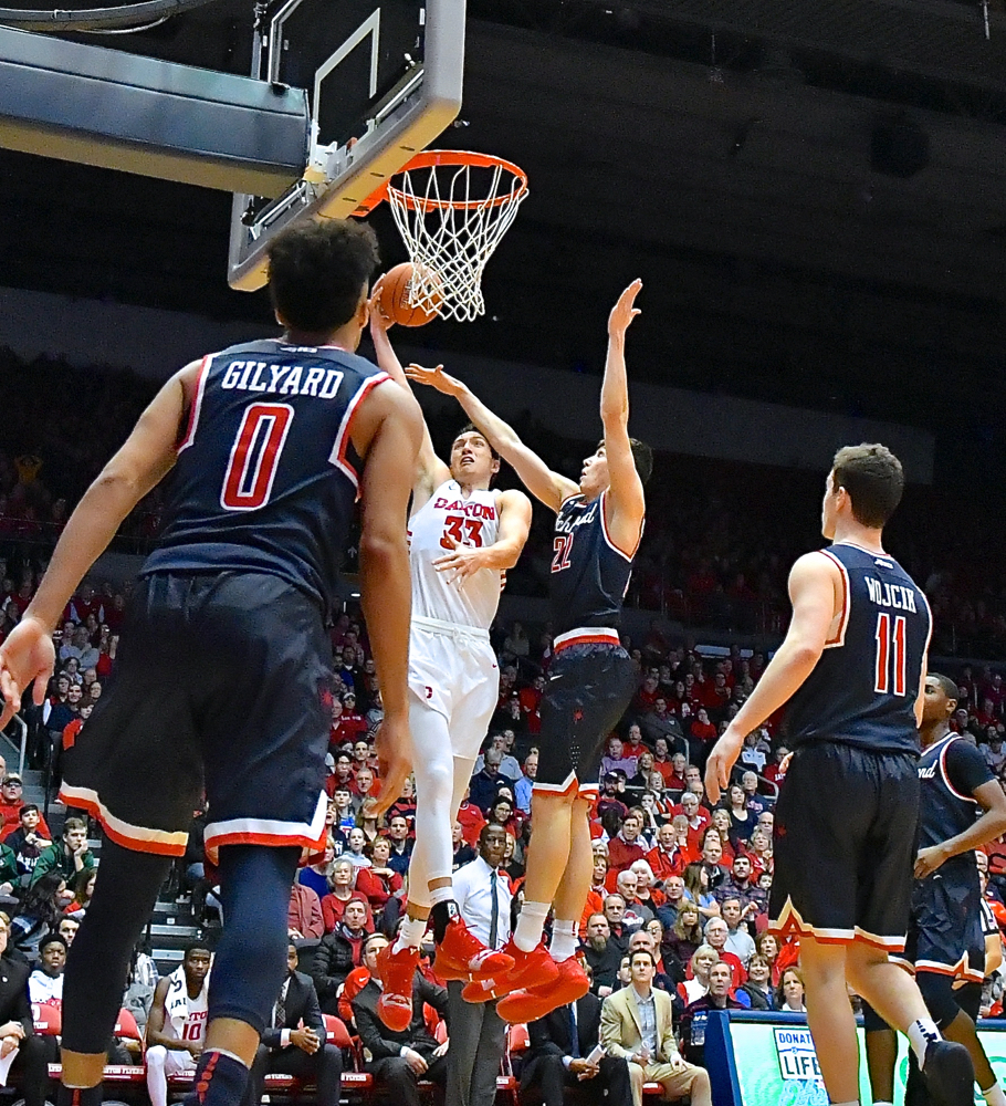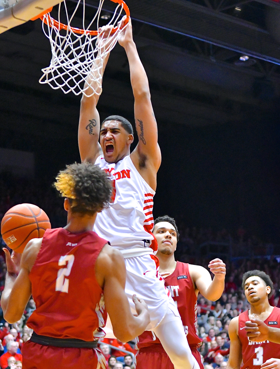 They were down by eleven points down with fourteen minutes left, but Dayton rallied behind Obi Toppin's 26 points (left) and late three-point shooting from Jalen Crutcher for a thrilling win over Duquesne. Read Hal McCoy's account for the game in today's Press Pros UD feature.