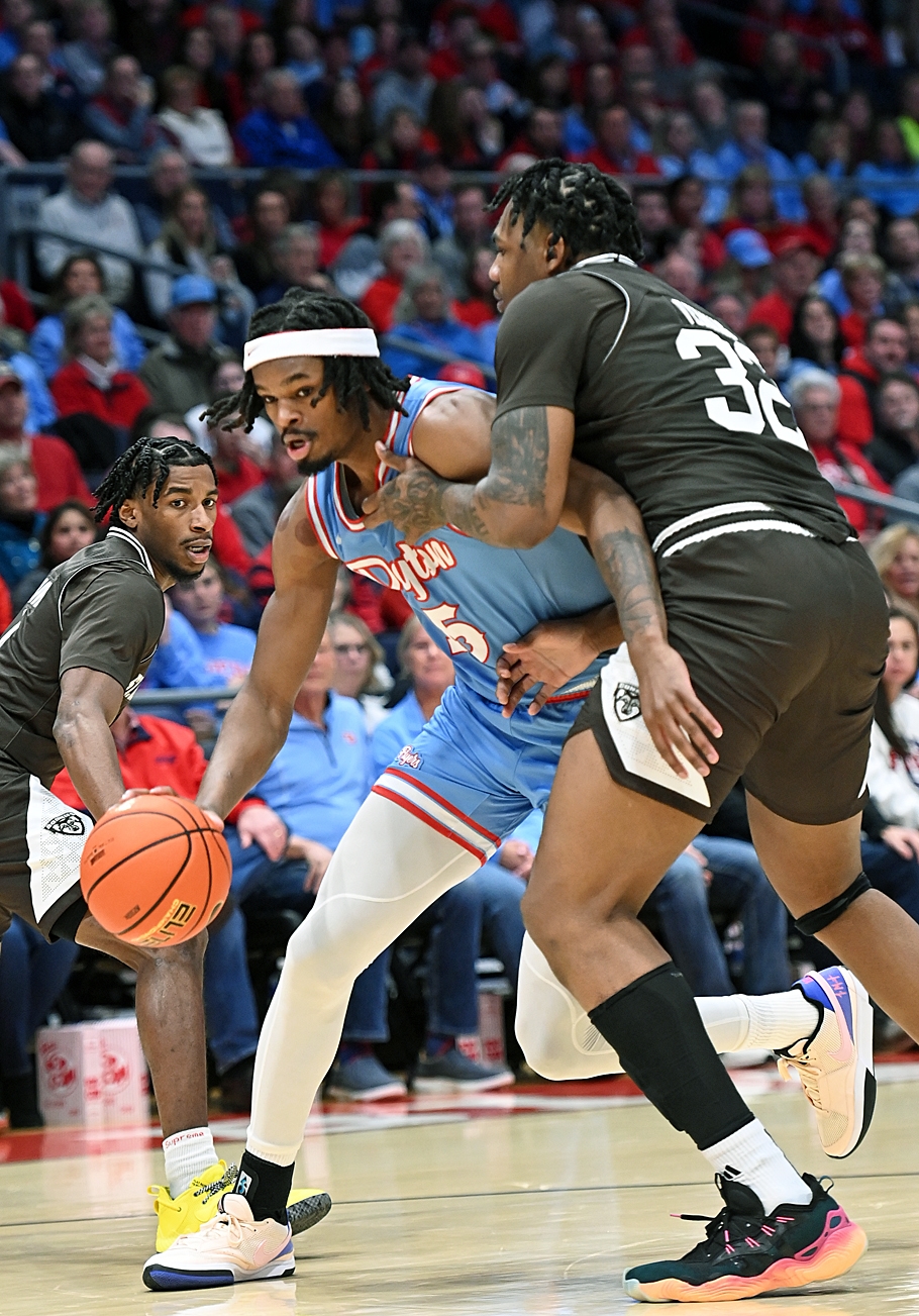 When the outside shots aren't falling, it is a good thing for the University of Dayton basketball team that they have DaRon Holmes II roaming near the basket. The Flyers trailed St. Bonaventure, 30-28, at the half, but pushed the ball inside the Holmes and he scored 25 of his 34 points in the second half to end UD to a 76-71 win.
